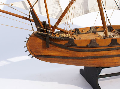 Se midió el largo y la variación de diámetros de la arboladura, y se preparó el palo mayor, la entena y el botalón ademas de los otros palos, se tiñeron en color miel, haciendo las perforaciones necesarias para la colocación de motones. Se prepararon las escaleras a la bodega, el timón central y el lateral